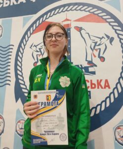 Ксюша — душа команди! Справжній капітан! Переборовши своє розчарування від відсутності супротивниць у своїй віковій категорії, весь день підтримувала молодших спортсменів! Зауважу, що команда розминалась разів шість. Не тому, що потрібно було, а тому, що одразу намагались разом відпрацювати щось новеньке з того, що побачили! Результат: перше місце, 16–17 років, до 55 кг.